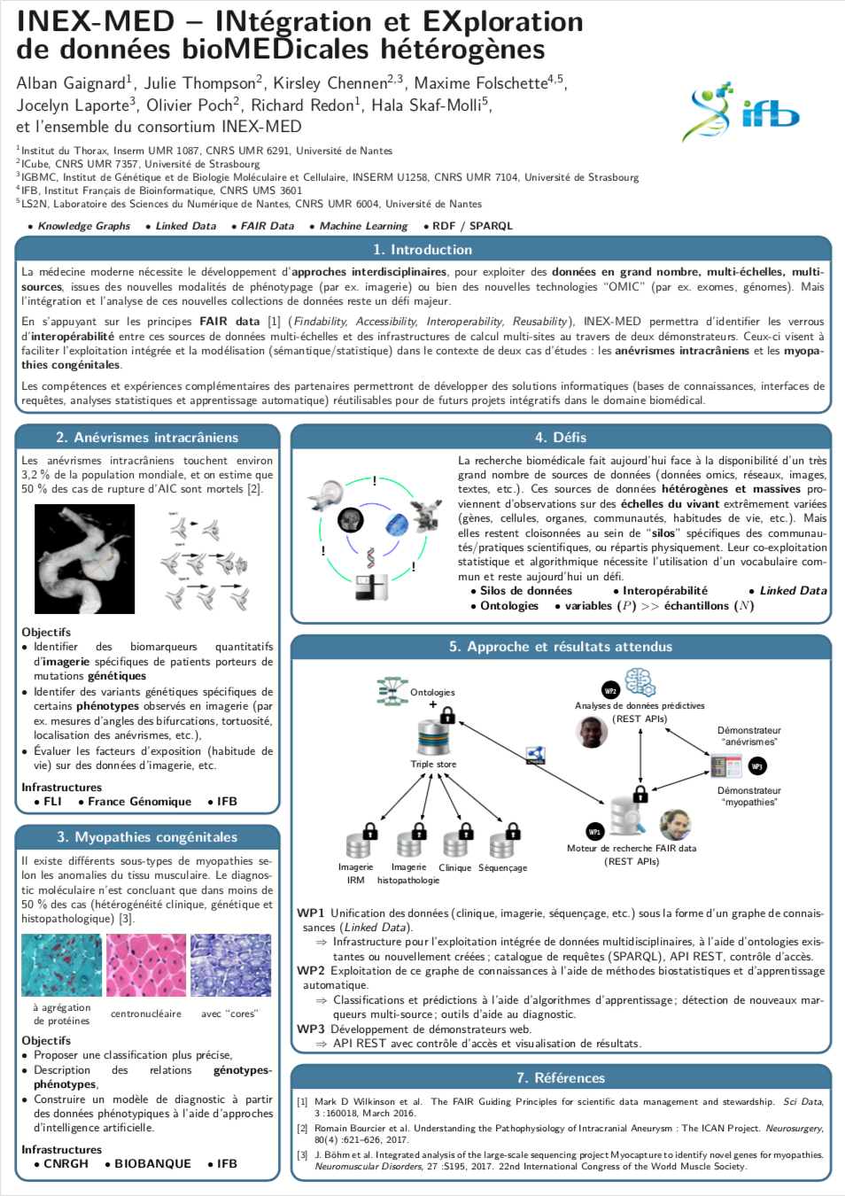 Les développements technologiques, autour de (i) la construction de bases de connaissances adoptant les principes de « FAIR data» (Findability, Accessibility, Interoperability, Reusability), (ii) l’interrogation des données sécurisées, et (iii) l’exploration intégrée des données via des méthodes de bio-statistiques et d’apprentissage automatique, seront mutualisés entre les partenaires. Cette infrastructure sera ensuite exploitée et validée via des approches intégratives afin d’améliorer les diagnostics/pronostics dans deux scénarios applicatifs: (i) INGEN-IA, pour l’étude de la formation et le développement des anévrismes intracrâniens, et (ii) MYO-lico, pour l’aide au diagnostic des différentes formes de myopathies. L’accent sera mis sur la réalisation d’une infrastructure générique, modulaire et portable, installable sur les ressources de l’IFB et réutilisable par l’ensemble de la communauté biomédicale.
